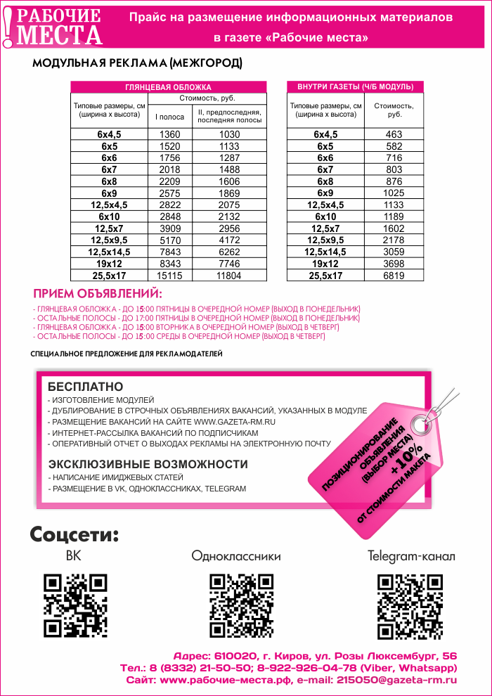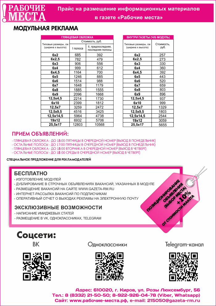 При подаче объявления в газету «Рабочие места» ваша информация одновременно будет: