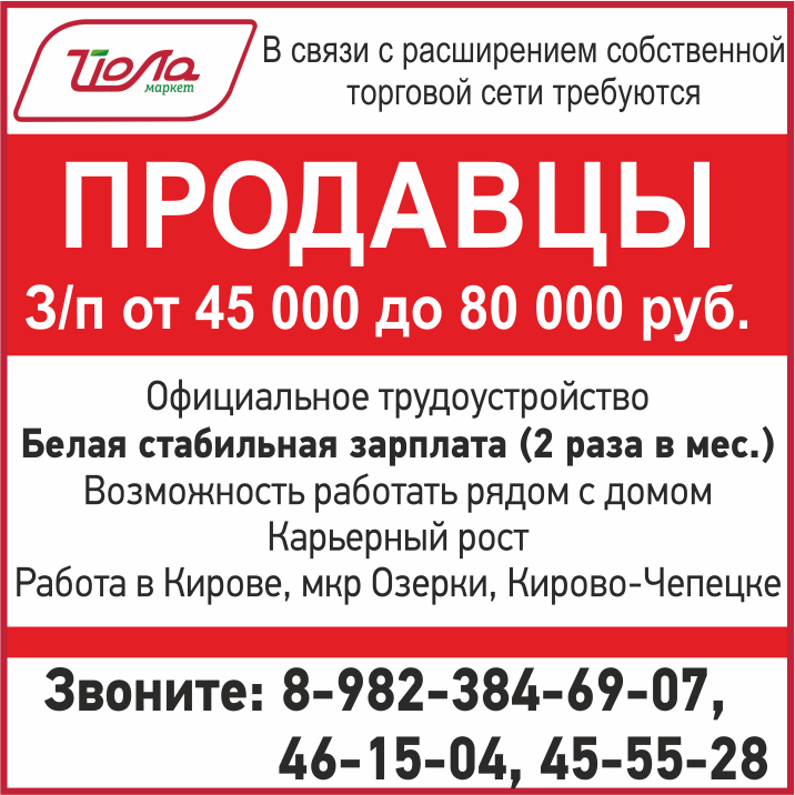 С Вашим изданием мне посчастливилось работать уже более 5 лет, причем, в нескольких организациях. Про качество работы Ваших сотрудников могу сказать только солнечно и отлично: вы работаете не только на результат своей газеты, но и - клиентов. "Палочкой-выручалочкой" я называю Ваше издание, а это о многом говорит: работаю с менеджером - Елсуковой Татьяной, вот о ком нужно вести разговор и слова благодарности, в большинстве отличные оценки, конечно, ей. Человечность, знание своего дела, словом, профессионал: она всегда посоветует, поможет. Мы провели анализ результативности работы пяти изданий г. Кирова, получили желаемый ответ - 80% соискателей вакансий информацию получают из Вашего издания, проблема с поиском сотрудников решается быстрее благодаря размещению объявлений в Вашем издании. Словом, МОЛОДЦЫ, мы с Вами работать продолжаем с большим удовольствием. Солнечных Вам и приятных клиентов, солнечных моментов в Вашей работе, результативности, просто человеческого благополучия. Очень Вам признательны!