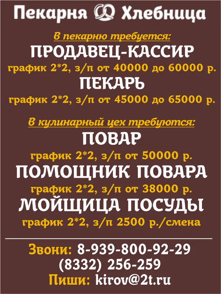Официальное оформление, соцпакет, скидки для сотрудников, развозка, медосмотр, спецодежда, обучение, возможен гибкий график, возможно совместительство